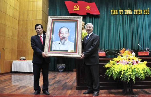 | Tổng Bí thư trao tặng ảnh Bác Hồ cho Tỉnh ủy Thừa Thiên Huế. |