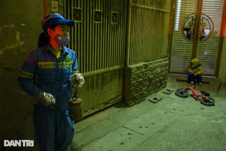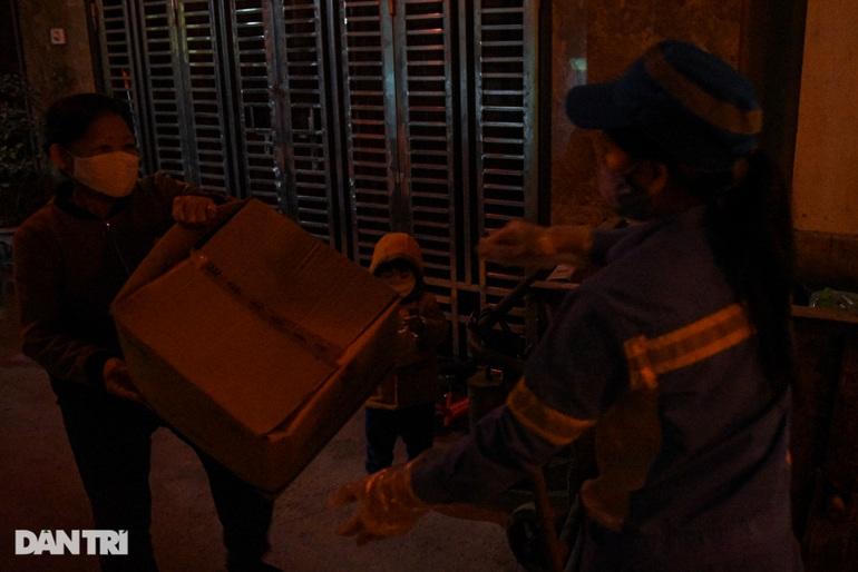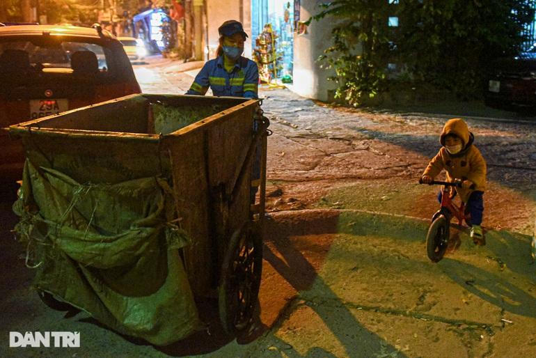Công việc của chị Lan là đẩy xe rác đi thu gom khắp các ngõ ngách trên đường Kim Mã về điểm tập kết, từ 3h chiều đến 2h sáng hôm sau, tổng quãng đường di chuyển hơn 6km.