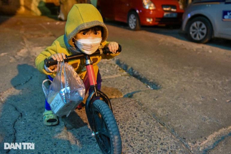 Cậu bé mặc áo khoác trùm mũ kín đầu, đeo khẩu trang đi lon ton theo mẹ. Trên đầu chiếc xe tí hon, treo lủng lẳng một túi nilon đựng gói bánh.