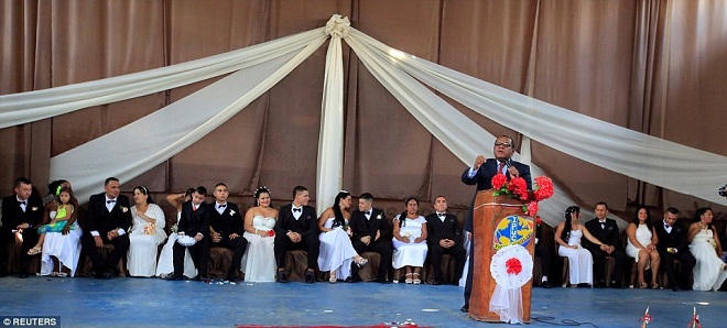 | Theo đó, 17 cô dâu cùng người thân trong gia đình đã được đưa vào khu vực trung tâm của nhà tù Carcell Villa Hermosa, nơi diễn ra đám cưới tập thể đặc biệt. |