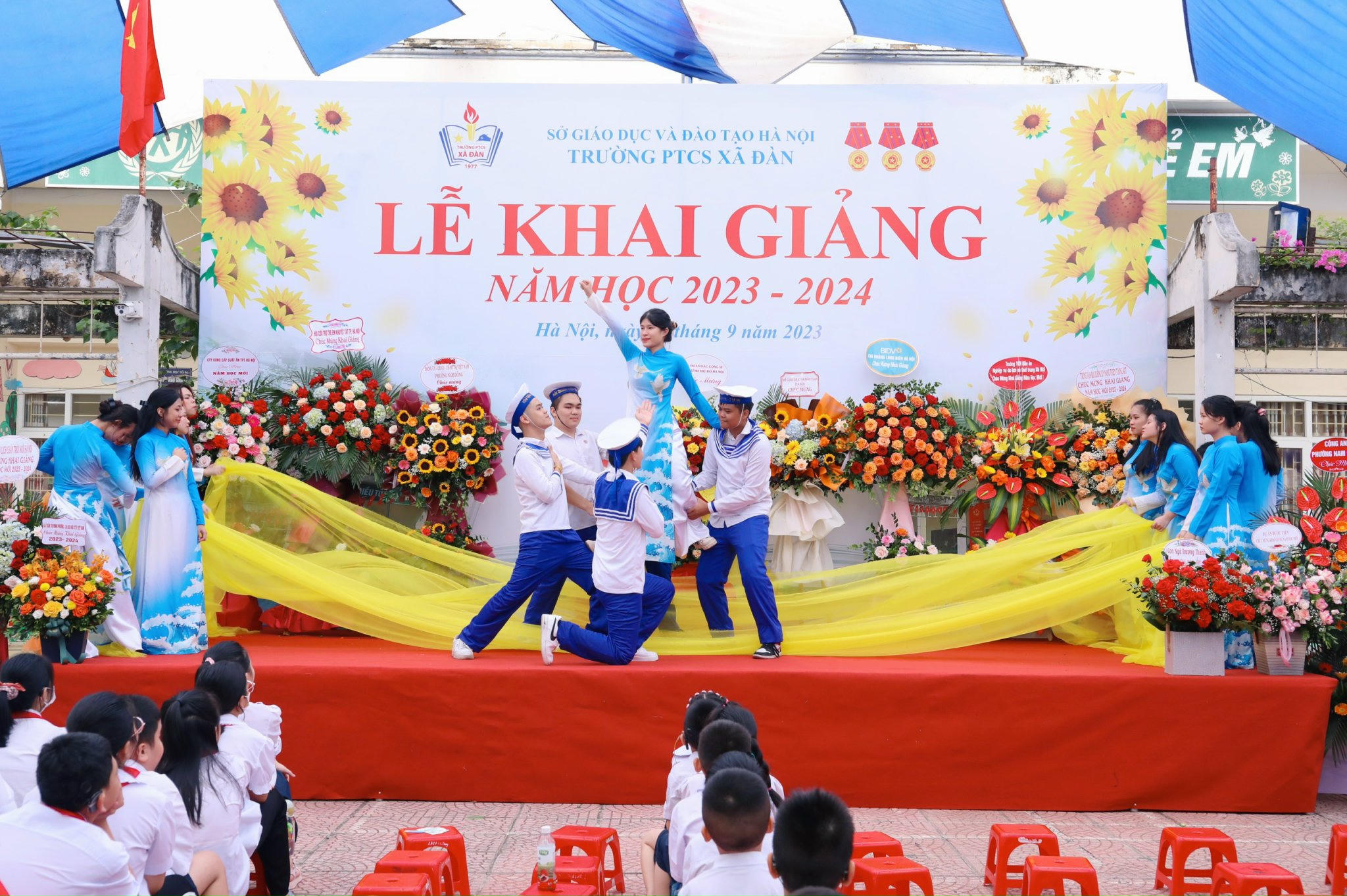 Đặc biệt hơn so với các lễ khai giảng trước đây, năm học mới này, Trường PTCS Xã Đàn được đón nhận lá cờ Đảng thân yêu, món quà từ Quần đảo Trường Sa và Hoàng Sa gửi tặng, với sự trao tặng của bà Hoàng Thị Hạnh. Đây là nguồn động viên, khích lệ to lớn để các em học sinh khiếm thính vững bước trên con đường chinh phục tri thức, năng khiếu và ước mơ của mình.