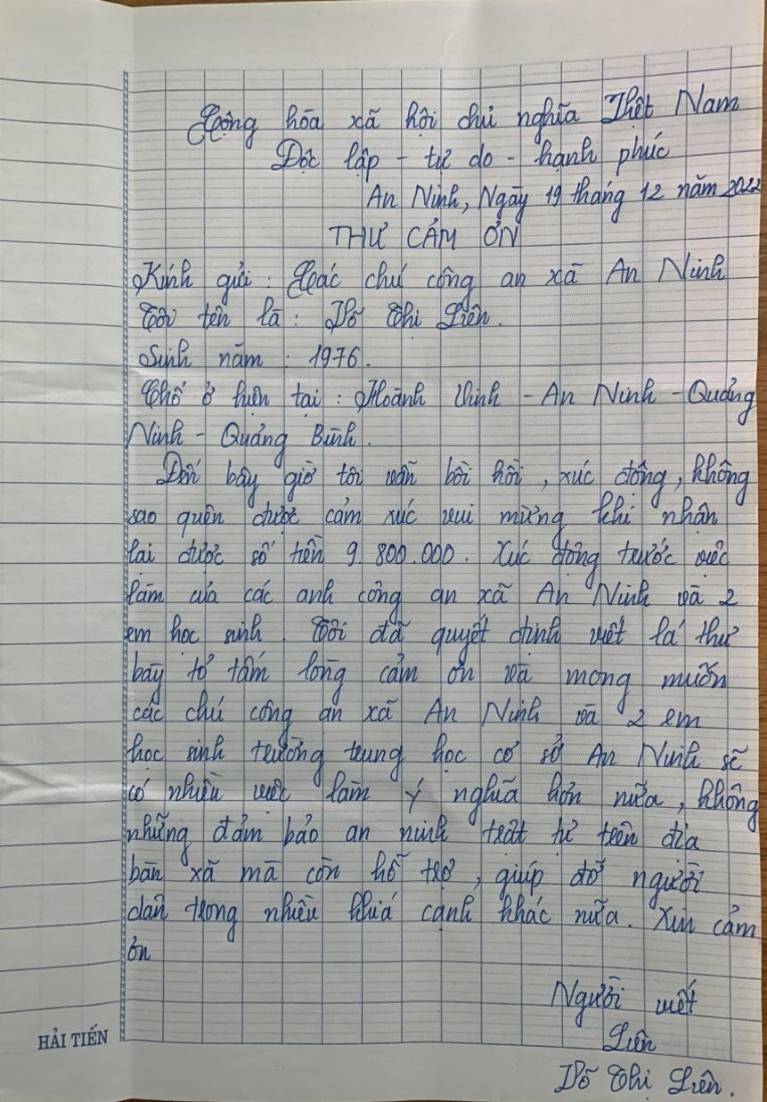Trong thư có đoạn: “Đến bây giờ tôi vẫn bồi hồi, xúc động, không sao quên được cảm xúc vui sướng khi nhận lại được số tiền. Xúc động trước việc làm của các anh Công an xã An Ninh và hai em học sinh.