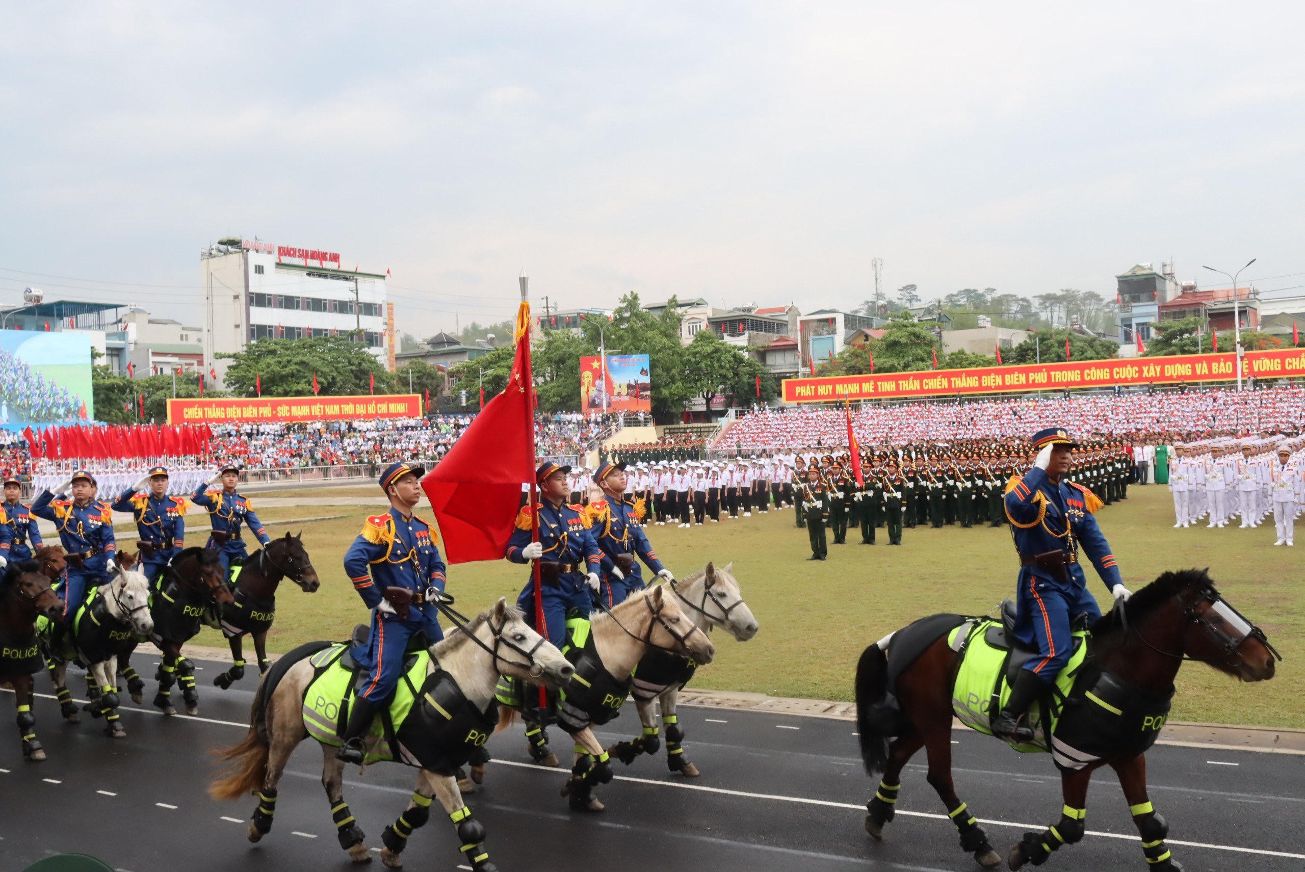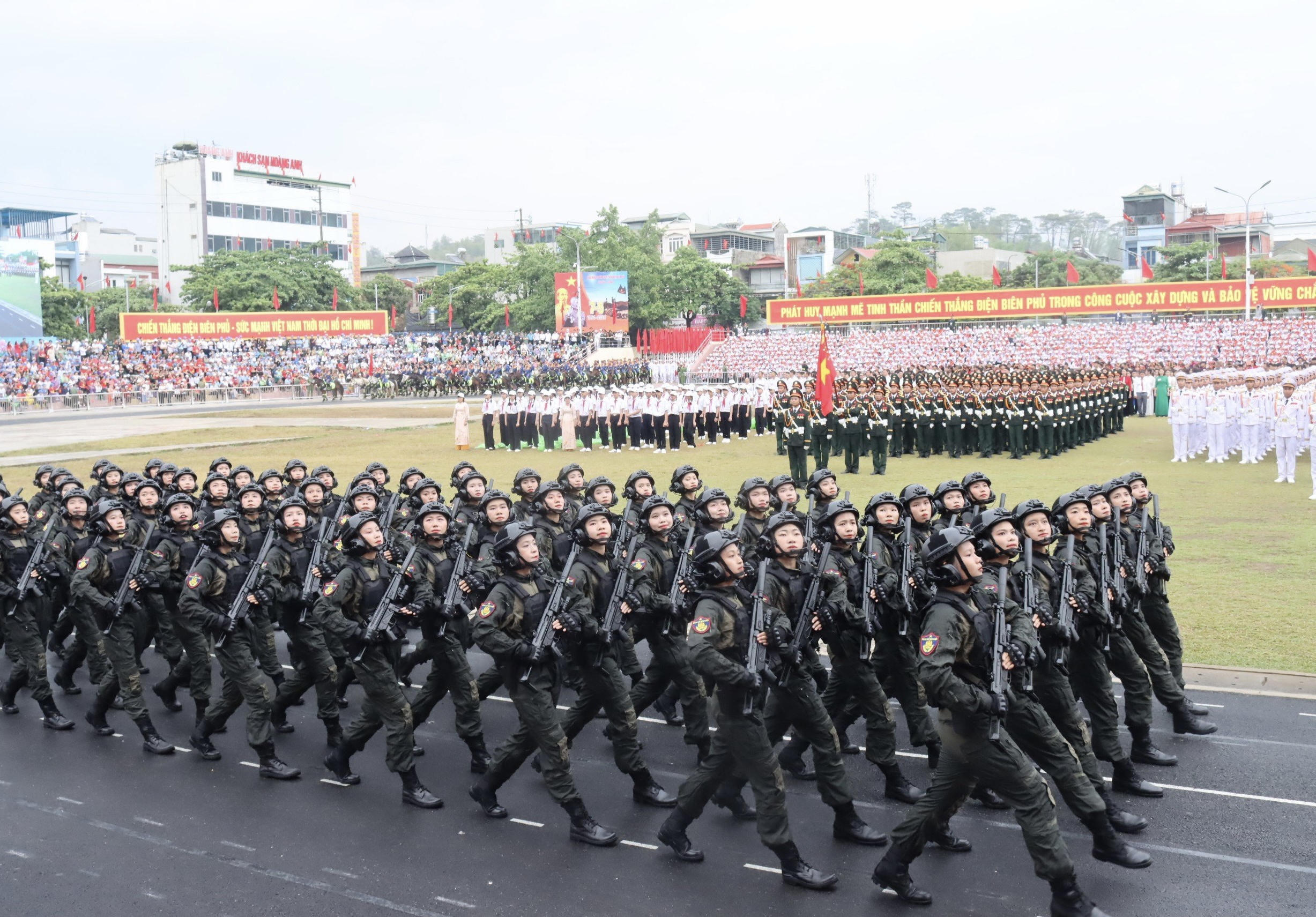 Ngay từ sáng sớm nay, khu vực tỉnh Điện Biên mưa lớn, nhưng hàng vạn người dân địa phương và du khách đã hướng về Sân vận động tỉnh Điện Biên và các tuyến đường lớn của thành phố - nơi đoàn diễu binh, diễu hành đi qua để chờ đón thời khắc lịch sử, thiêng liêng diễn ra. Khoảng 8h15, mưa ngớt dần, đây cũng là thời điểm diễn ra lễ diễu binh, diễu hành.