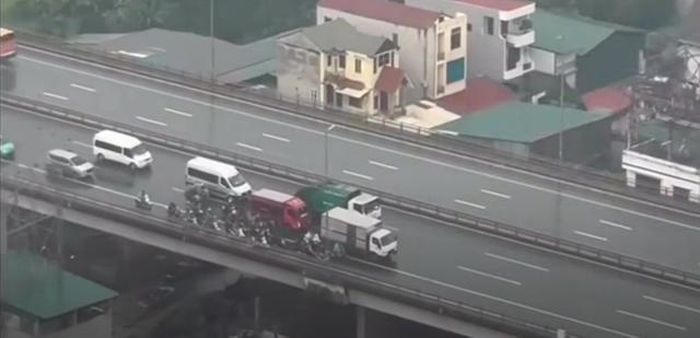 Clip ghi lại khoảnh khắc các xe ô tô đi chậm trên cầu Nhật Tân để tránh gió cho xe máy (Ảnh cắt từ clip được chia sẻ trên MXH). |