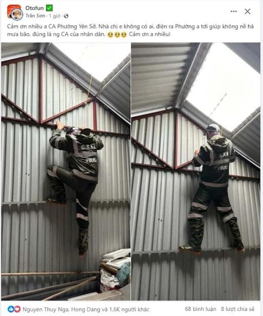 Người dân chia sẻ hình ảnh công an phường Yên Sở, quận Hoàng Mai, Hà Nội đến giúp đỡ không quản bão giông. (Ảnh: MXH) |