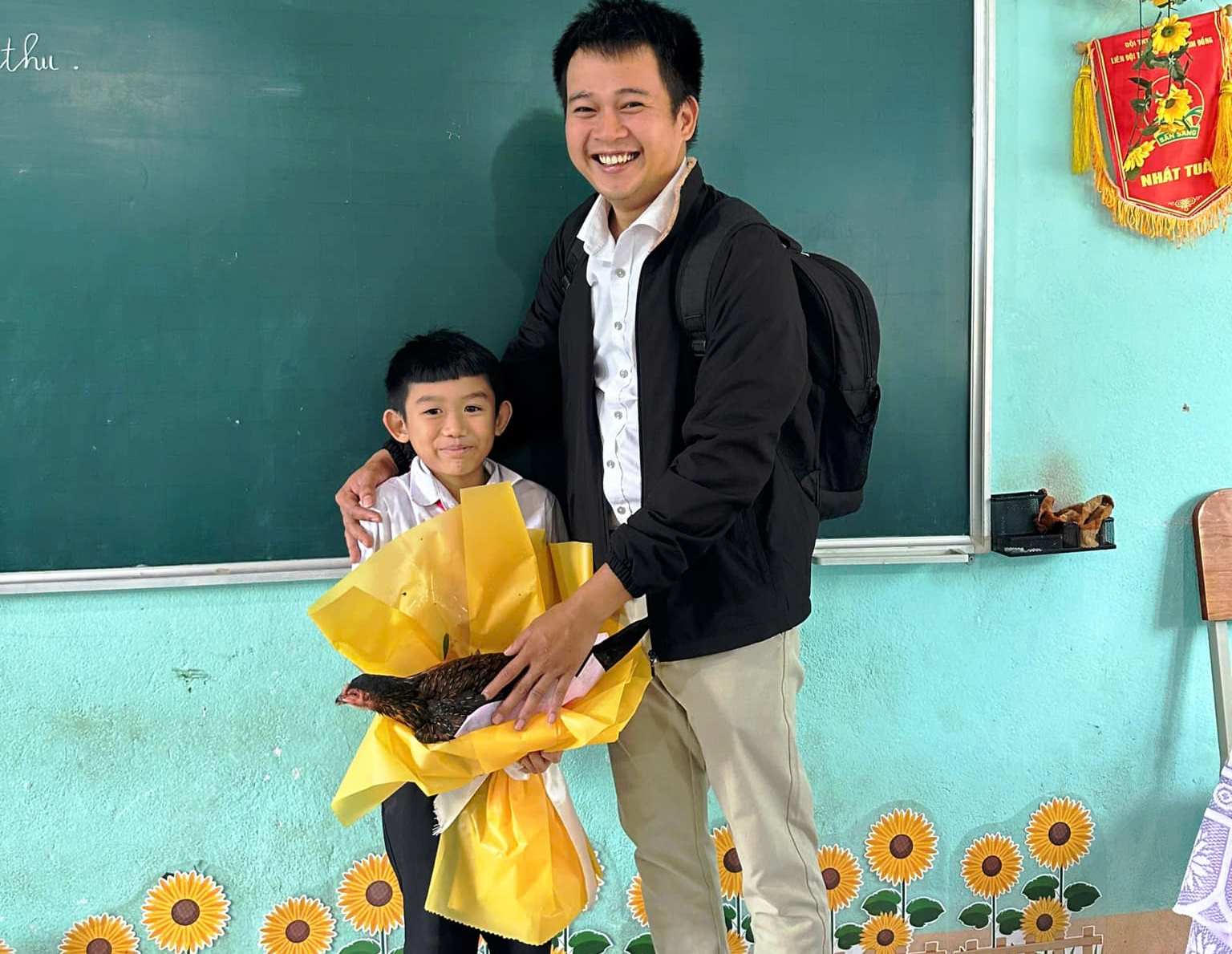 Thẹn thùng đi sau cả lớp, cậu học trò Nguyễn Dong Bin cũng chuẩn bị một bông hoa nhưng hết sức đặc biệt lên bục giảng rồi rụt rè nói “em không tìm được hoa nào đẹp nên em mượn giấy bó hoa kèm con gà mái em nuôi để tặng thầy bồi dưỡng, có sức khỏe, tiếp tục dạy bọn em học”.