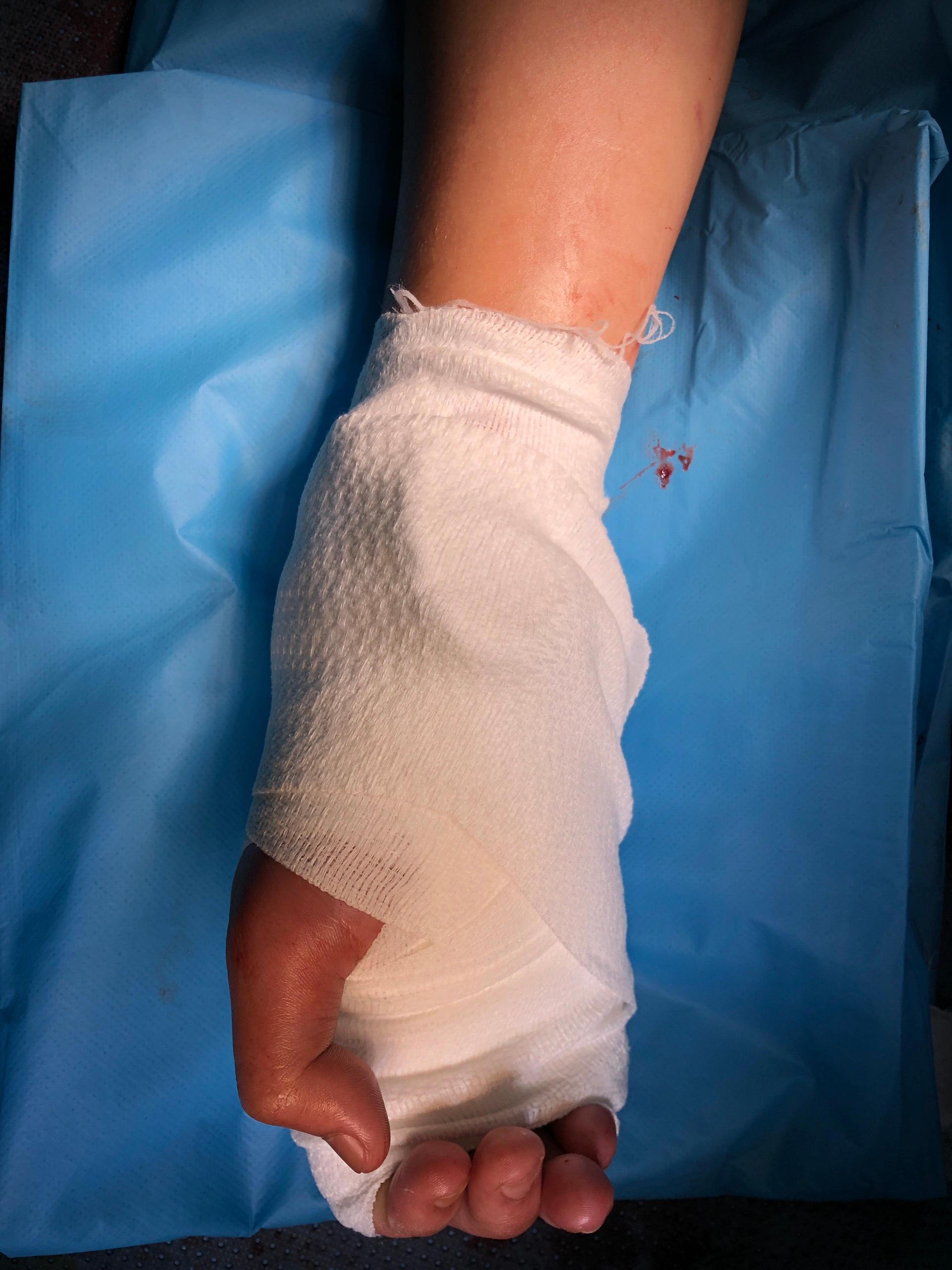 Bệnh nhân T. Đ. K (SN 2004, ngụ An Giang) nhập viện với tình trạng vết thương đứt lìa bàn tay phải ở vị trí cổ tay, chéo vát từ nếp gấp cổ tay đến khớp bàn ngón 5, vết đứt sắc gọn, nhiều dị vật.