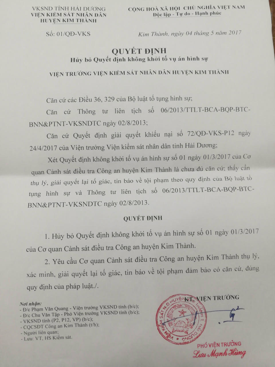 Ngay sau đó, VKSND tỉnh Hải Dương đã ra Quyết định 72/QĐ/VKS-P12 ngày 24/4/2017 yêu cầu: Hủy quyết định giải quyết khiếu nại 01A/QĐ-VKS-KT ngày 27/3/2017 của Viện trưởng VKSND huyện Kim Thành.