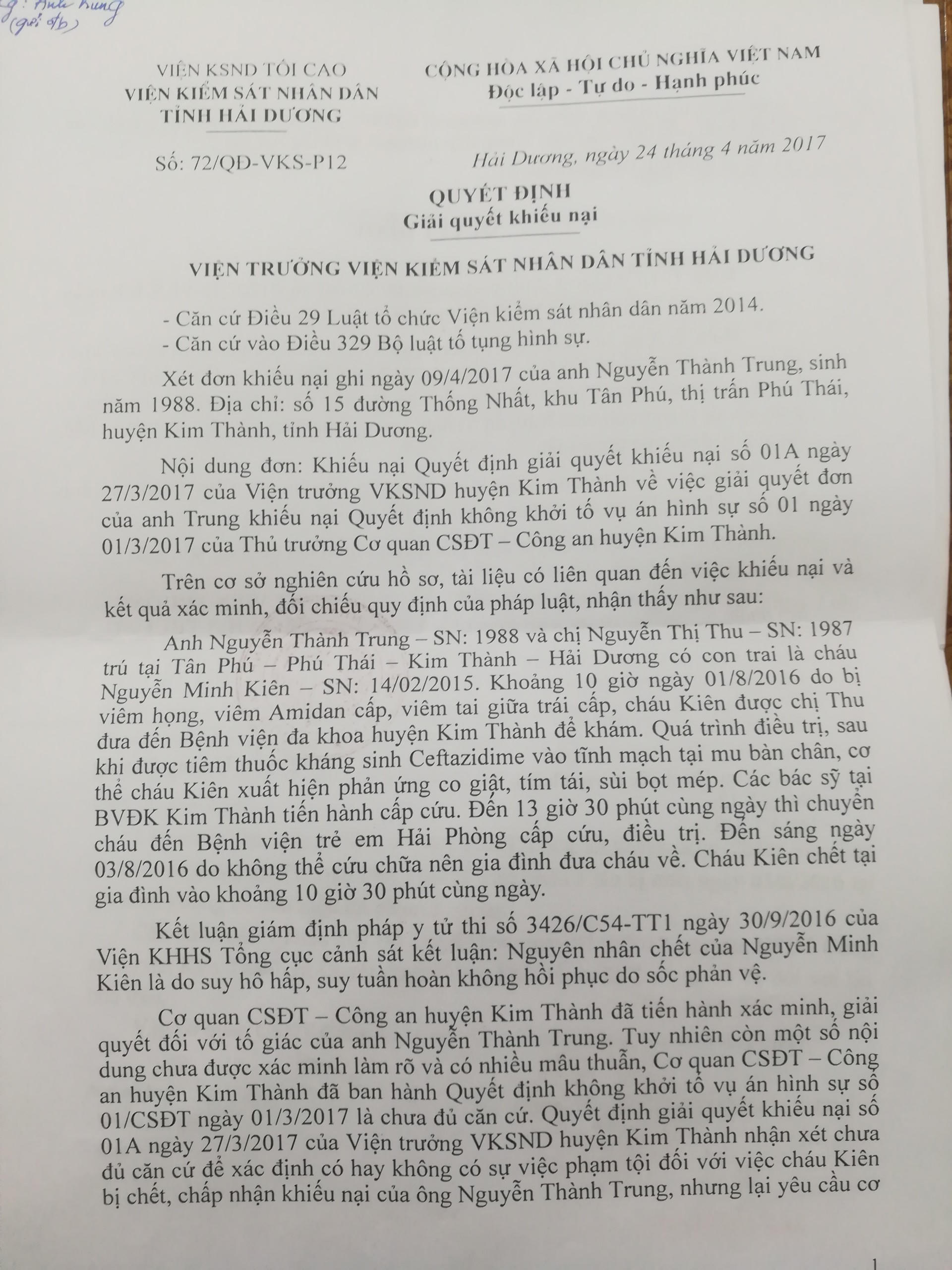 Cho rằng việc ban hành quyết định trên của VKSND huyện Kim Thành là chưa thỏa đáng, gia đình anh Trung đã làm đơn khiếu nại vụ việc lên VKSND tỉnh Hải Dương.