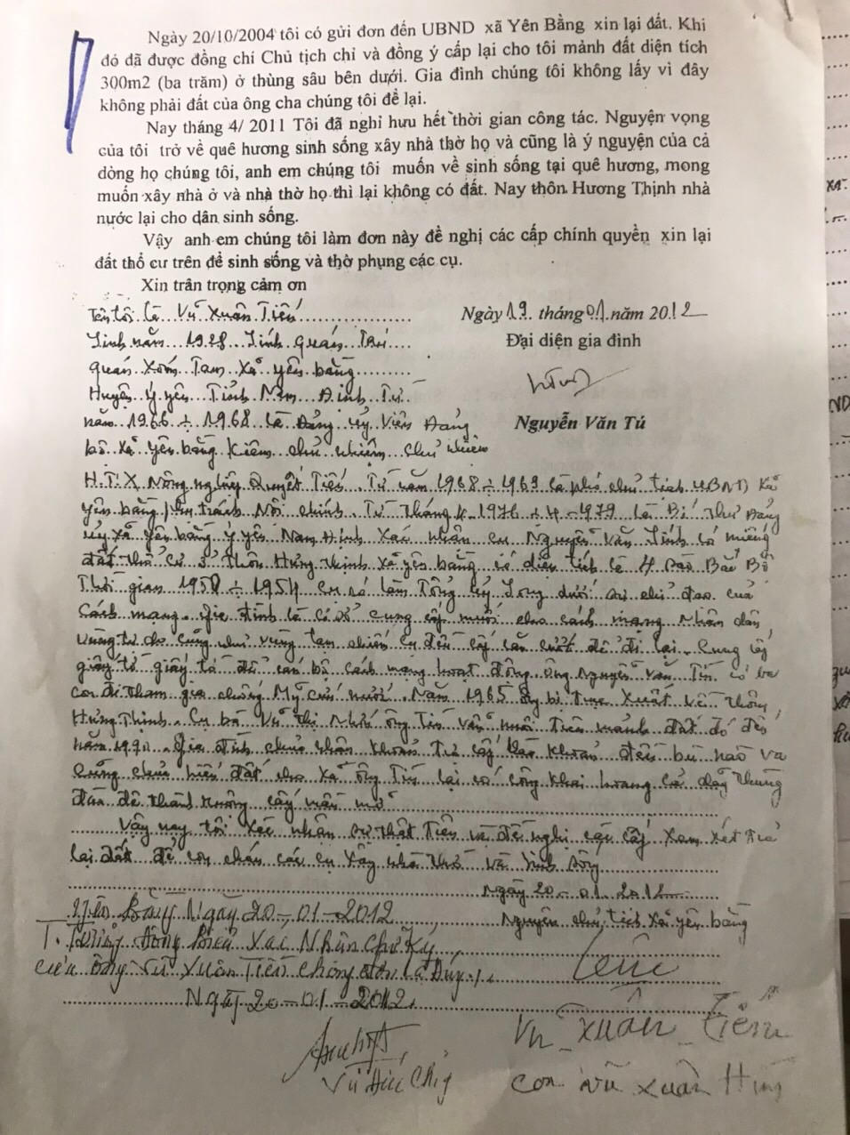Đến năm 2004, anh em ông Tú mới có đơn đề nghị UBND xã Yên Bằng và chính quyền các cấp về việc xin lại miếng đất trên để xây nhà thờ nhưng chưa được giải quyết vì bản thân các đương sự không có giấy tờ pháp lý chứng minh thửa đất là của gia đình. Hồ sơ địa chính xã không có tên hộ gia đình cụ Nguyễn Văn Sinh - Vũ Thị Nhớn.