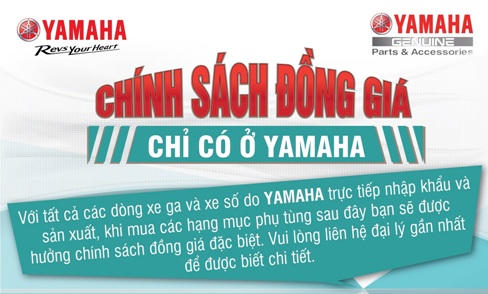 (PLO) -Yamaha Motor Việt Nam vừa chính thức triển khai Chính sách “Đồng giá”cho phụ tùng và tiền công thay thếtại tất cả các đại lý 3S và 2S của Yamaha trên toàn quốc.
