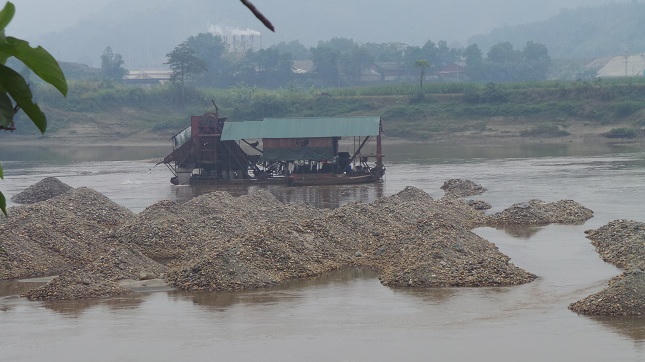 | Những đống sỏi thải ngay giữa lòng sông làm thay đổi dòng chảy của sông Hồng |