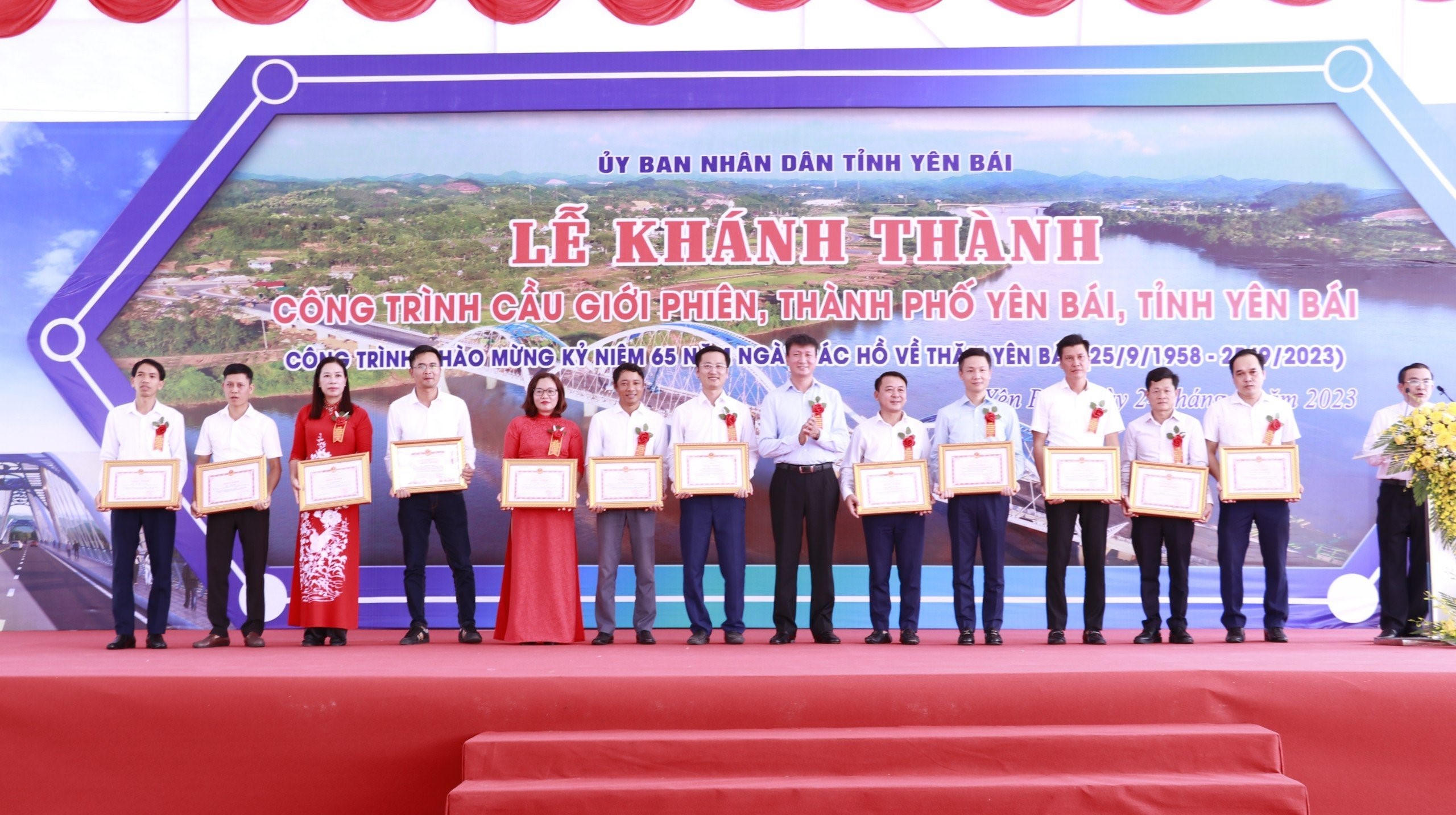 Nhân dịp khánh thành, UBND tỉnh Yên Bái tặng thưởng cho các cá nhân, đơn vị có thành tích xuất sắc trong việc đưa công trình cầu Giới Phiên về đích sớm hơn dự kiến. Ảnh: Nhật Nguyên. |