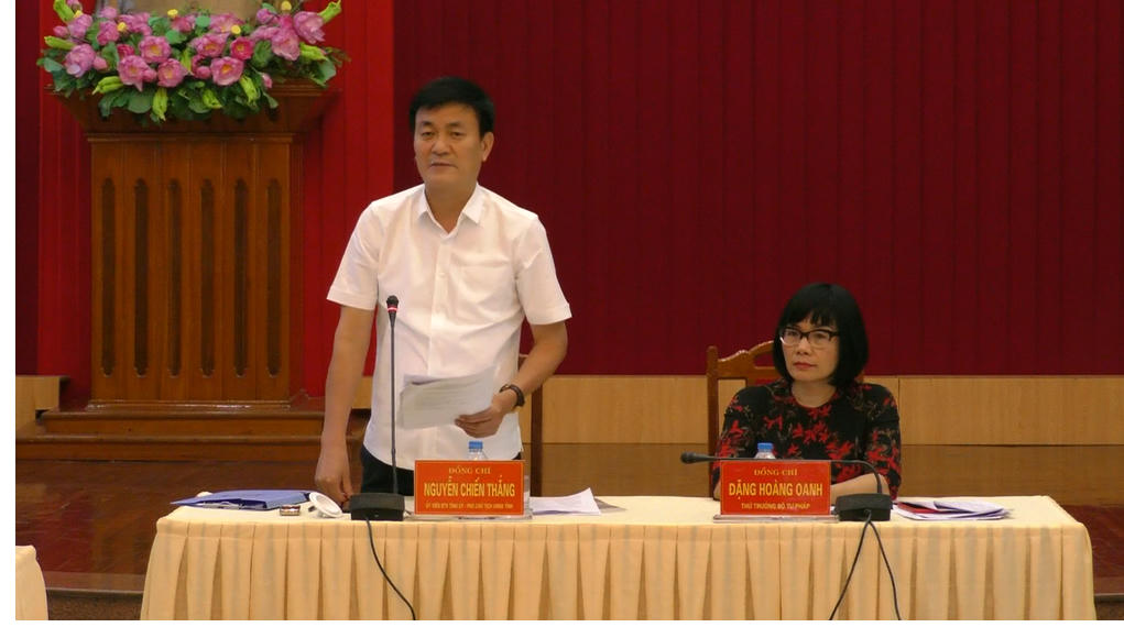 Làm việc với đoàn có đồng chí Nguyễn Chiến Thắng, Ủy viên Ban Thường vụ Tỉnh ủy, Phó Chủ tịch UBND tỉnh; Đại diện Lãnh đạo các cơ quan: Ban Nội chính Tỉnh ủy, Ủy ban Mặt trận Tổ quốc Việt Nam tỉnh, Viện Kiểm sát nhân dân tỉnh, Văn phòng Đoàn ĐBQH, HĐND và UBND tỉnh, Sở Tài chính, Sở Nội vụ, Thanh tra tỉnh, Công an tỉnh; Lãnh đạo Sở Tư pháp; Đại diện Lãnh đạo UBND và Trưởng phòng Tư pháp các huyện: Trấn Yên, Yên Bình, thành phố Yên Bái.