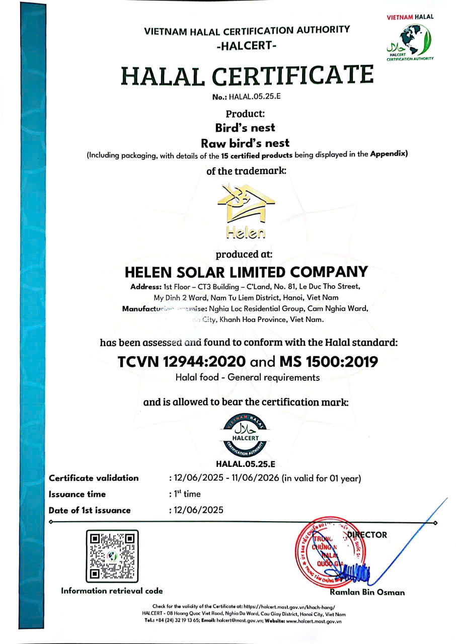 Chứng nhận Halal đối với sản phẩm yến chưng và yến thô của Công ty TNHH Helen Solar - Yến Khánh Hoà. |