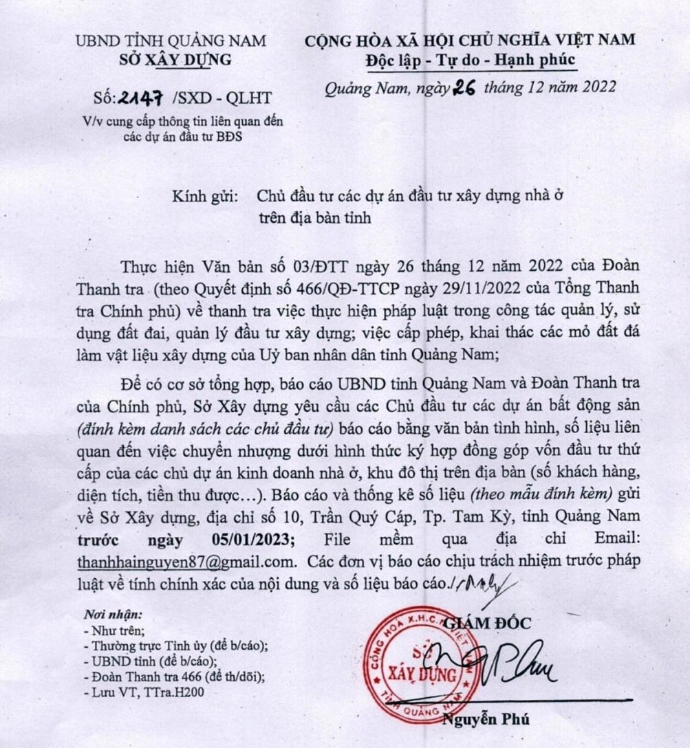Ngày 29/12, tin từ Sở Xây dựng tỉnh Quảng Nam, đơn vị vừa có văn bản 2147/SXD-QLHT gửi các chủ đầu tư về việc cung cấp thông tin liên quan đến 104 dự án đầu tư xây dựng nhà ở trên địa bàn tỉnh để tổng hợp, báo cáo cho UBND tỉnh Quảng Nam và đoàn thanh tra của Tổng Thanh tra Chính phủ.