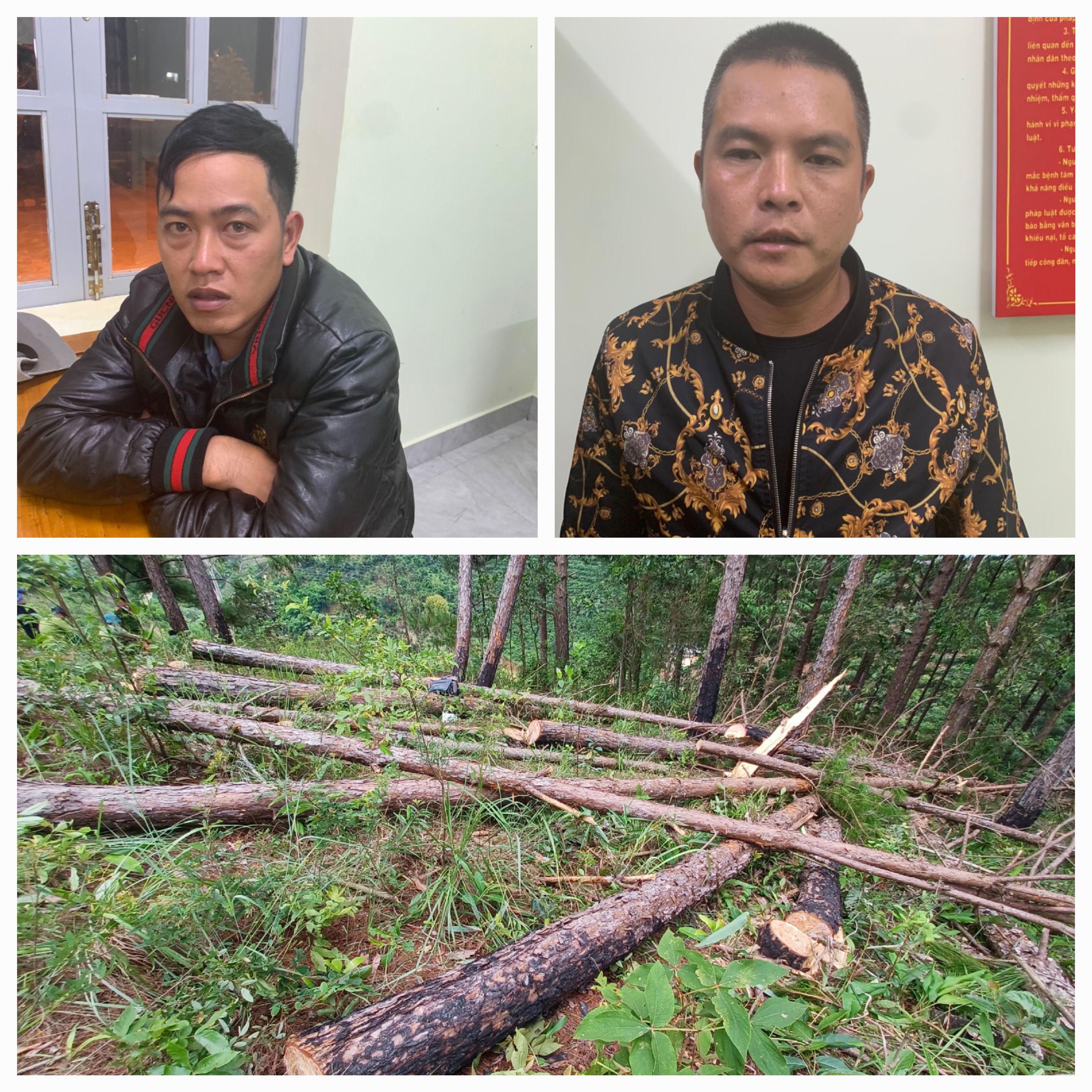 Hai đối tượng vụ phá rừng và hiện trường cây thông bị cưa hạ. Ảnh Công an tỉnh Lâm Đồng. |