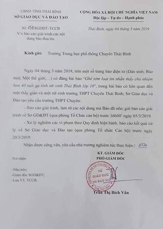 (PLVN) - Ngay sau khi báo chí thông tin về việc cư dân mạng phản ánh một thầy giáo hơn 40 tuổi tên T. nhắn tin gạ tình nữ sinh lớp 10 do thầy này chủ nhiệm, ngày 4/3, Sở Giáo dục và Đào tạo tỉnh Thái Bình có Công văn gửi Trường THPT Chuyên Thái Bình yêu cầu trường báo cáo giải trình sự việc.