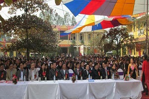 Mỗi người một một công việc lại ở xa nên chúng tôi về đến trường lúc lễ kỷ niệm đã bắt đầu được ít phút. Xếp hàng sau một vài khóa học sinh cũ vào dự, tôi thấy lòng bồi hồi khi nghe giai điệu của bài hát “Yêu mãi trường tôi” do thầy Tào Tuấn Sửu – giáo viên dạy Lý sáng tác dành tặng trường vang lên: “Trường tôi, bên sông Hồng, giữa cánh đồng lúa xanh, miền quê nhãn lồng, một miền quê văn hiến. Trường phổ thông trung học Đức Hợp mến yêu…”.