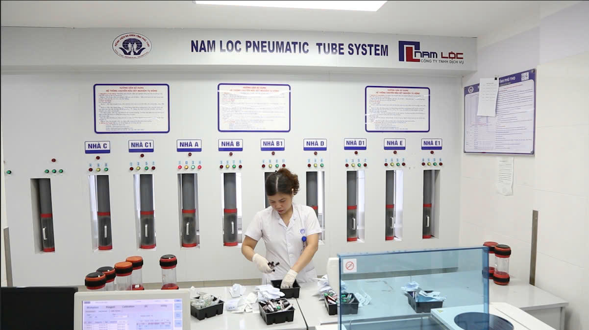 Khu tiếp nhận mẫu từ hệ thống vận chuyển tự động hút chân không. Ảnh: BV Đa khoa tỉnh Phú Thọ |